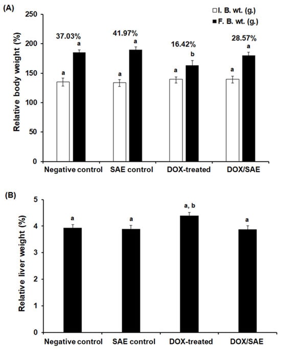 (A) The relative body weight percentages. (B) The relative liver weight in the different groups under study. I.B.W, initial body weight; F.B.W, final body weight; SAE, Syzygium aromaticum extract; DOX, Doxorubicin. Data are expressed as mean ± S.D., n = 10. Means that do not share a letter showed a significant difference (p < 0.05).