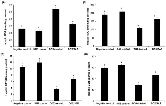 Hepatic malondialdehyde (MDA) (A), superoxide dismutase (SOD) (B), catalase (CAT) (C), and reduced glutathione (GSH) (D) levels in the different groups. SAE, Syzygium aromaticum extract; DOX, Doxorubicin. The values represent means ± S.D., n = 10. Means that do not share a letter showed a significant difference (p < 0.05).