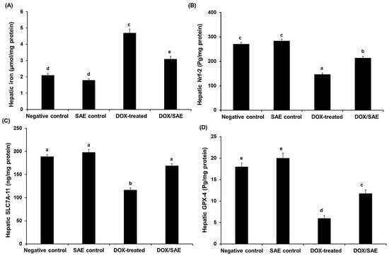 Hepatic iron (A), nuclear factor erythroid 2-related factor 2 (NRF-2) (B), solute carrier family 7, member 11 (SLC7A-11) (C), and glutathione peroxidase (GPX-4) (D) in the different groups. SAE, Syzygium aromaticum extract; DOX, Doxorubicin. The values represent means ± S.D., n = 10. Means that do not share a letter showed a significant difference (p < 0.01).