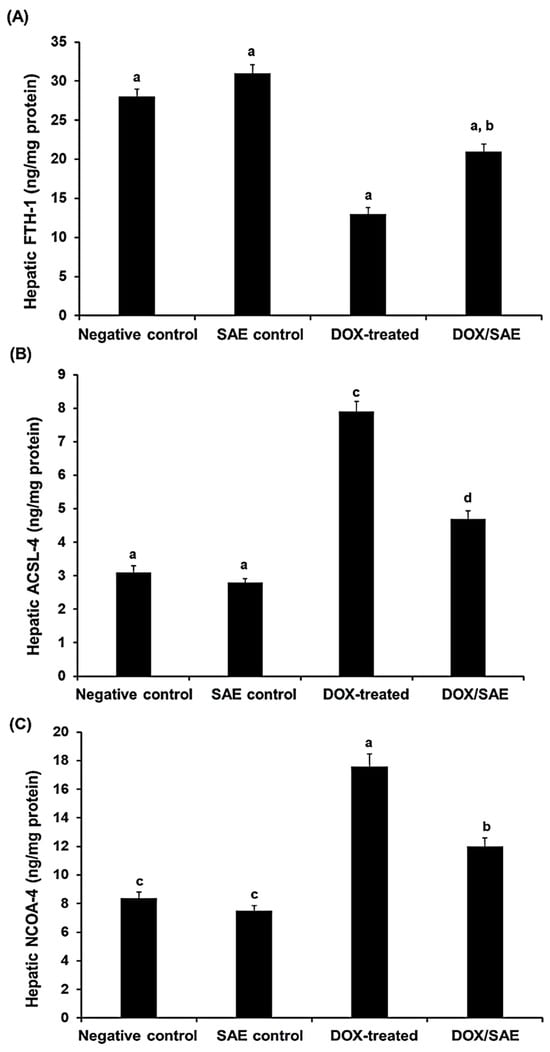 Hepatic ferritin heavy chain-1 (FTH-1) (A), acyl–CoA synthetase long-chain family member 4 (ACSL-4), (B), and nuclear receptor coactivator 4 (NCOA-4) (C) in different groups. The values represent means ± S.D. (n = 10). SAE, Syzygium aromaticum extract; DOX, Doxorubicin. Means that do not share a letter showed a significant difference (p < 0.05).