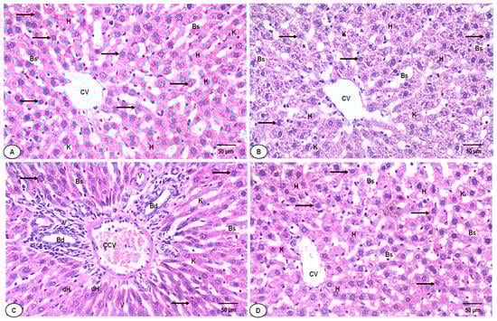 Liver tissues were sectioned at 5 μm, embedded in paraffin wax, washed in xylene, and then sliced and fixed in 10% buffered formalin. Hematoxylin and eosin (H&E) staining was applied to the sections, which were then viewed under an Olympus CX31 light microscope and captured on a digital camera (Olympus Camedia 5060, Tokyo, Japan) []. Hepatic damage was analyzed based on the severity and tissue damage percentage. A scale (0–4) was used, where 0 is normal tissue, 1 is <25% hepatic tissue damage, 2 is 26–50% hepatic tissue damage, 3 is 51–75% hepatic tissue damage, and 4 is >75% hepatic tissue damage [].