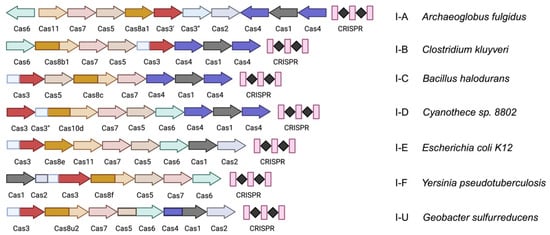 | I-E | Cas1, Cas2, Cas5, Cas6, Cas7, Cas8e, Cas11, Cas3 |