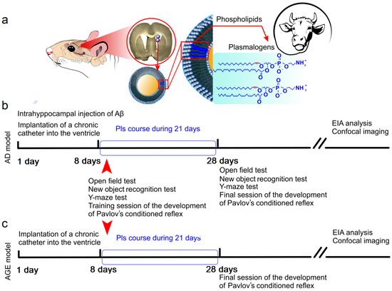 Therefore, in this study, we investigate the effect of Pls on cognitive functions and the lymphatic clearance of soluble Aβ from the brain of male mice using two functional models: (1) the injection model of AD induced by injecting recombinant Aβ 1–42 into the right dentate gyrus of the hippocampus and reflecting the early stages of AD; and (2) the age model depicting natural age-related changes in Aβ accumulation in the brain [77] (Figure 1a–c).