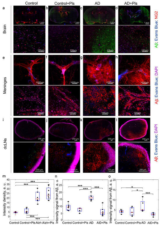The Aβ (Aβ1–42) levels were measured in the whole brain, its meninges, and in the deep cervical lymph nodes (dcLNs) using the standard protocols for immunohistochemistry. The choice of these tested tissues was related to the purpose of study of the effects of Pls on the lymphatic removal of soluble Aβ from the central nervous system (CNS), i.e., the removal of Aβ dissolved in the cerebrospinal fluid (CSF), which drains Aβ from brain tissues into its meninges and then into dcLNs, the first anatomical station for collection of CSF with substances dissolved [27,28,29].