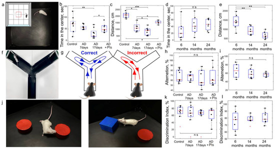 The new object recognition test was used for assessment of short-term recognition memory [103,104]. Mice were placed in a black box (33 cm × 33 cm × 20 cm) using a video-tracking package (Figure 3j). Two similar objects (red cylinders) were presented to mice for 10 min during the familiarization session. Afterward, during testing session, one of cylinders was replaced by a new object for 10 min (blue cube). Since the quality of test performance is strongly influenced by the experimental environment and external signals [105], the mice were adapted to the test for 10 days. To do this, the experimentalist took them in hands for 1 min every day for 7 days [105]. Furthermore, during habituation phase, mice were placed into the testing arena without any objects for 5 min during 3 days before the test.