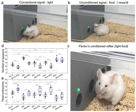The effects of Pls on the development of Pavlov’s conditioned reflex in AD mice and mice of different ages: (a–c) the training of mice is based on the presentation of an unconditional signal (green light), after which the animal receives food (reward) if it accidentally finds the correct window, in which food (seeds) falls out when the head is howled. The number of training sessions required for the mouse to form a stable conditioned reflex is assessed (when the light is turned on, the mouse must quickly (within 15 s) find the correct window and receive food (reward)). The number of rewards (food) received is also assessed in the final session; (d,e) Assessment of Pavlov’s conditioned reflex in AD mice and mice of different ages, n = 8 in each group, *—p < 0.05, **—p < 0.01, ***—p < 0.001, ns means not significant, the ANOVA test with the post hoc Duncan test.