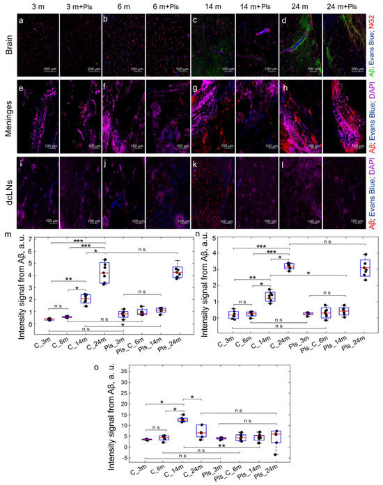 In the first step, we answered the question of whether Pls can stimulate Aβ removal from the brain and improve cognitive dysfunction at the early stages of AD. For this purpose, an injection model of AD (unilateral Aβ injection into the hippocampus) was chosen, which allows one to study the early stages of Aβ-induced changes in brain tissues and functions [78,79,80]. The studies were conducted in four groups: (1) the control (3-month-old mice); (2) the control + Pls; (3) AD (3-month-old mice); and (4) AD + Pls. Figure 2a,e,i,m–o show that in the control, the small amounts of Aβ are present in brain tissues, its meninges, and in dcLNs, which is consistent with the results of other researchers [77,81]. At the same time, Pls did not change the Aβ level in the studied tissues in the control (Figure 2b,f,j,m–o). In the AD group, the Aβ level was significantly higher than in the control group in all studied tissues (Figure 2c,g,k,m–o). It is important to note that a 21-day course of Pls reduced the level of Aβ in the brain, its meninges, and in dcLNs in AD mice (Figure 2d,h,l,m–o). The ELISA analysis confirmed the confocal data and demonstrated the increased level of Aβ in brain tissues of mice from the AD group, which decreased after the Pls course (Table 1). There was no effect of Pls on the Aβ amount in the brain in the control groups, possibly due to the low level of brain Aβ in the normal state (Table 1).