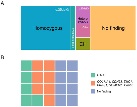 The distribution of patients depending on the presence of variants in different genes. (A) the investigated groups include conventional sensorineural hearing loss and (B) auditory neuropathy spectrum disorders. Abbreviations: CH—compound heterozygote.