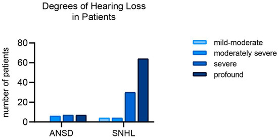 Distribution of patients with auditory neuropathy spectrum disorders (ANSDs) and sensorineural hearing loss (SNHL) by degree of hearing loss (mild—26–40 dB, moderate—41–55 dB, moderately severe—56–70 dB, severe—71–90 dB, profound—91+).