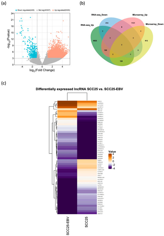 (a) The volcano plot illustrates the DEGs of lncRNAs in OSCC tissues relative to normal adjacent tissues from RNA-seq datasets (p < 0.001 and a fold-change cutoff of 2). (b) Venn diagram showing the lncRNAs identified via both microarray and RNA-seq analyses. (c) Heatmap showing the expression of 30 upregulated and downregulated lncRNAs in EBV-positive SCC25 cells compared with EBV-negative SCC25 cells from microarray datasets; the value represents the intensity of normalized data read from detected signal.