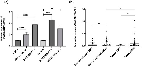 (a) Relative expression of VWA8-AS1 in EBV-positive HSCs and SCC25 cells compared with that EBV-negative HSCs and SCC25 cells, respectively; Shapiro–Wilk test was used for data normality analysis (p > 0.05 in all groups), and the data were analyzed using t-tests. (b) Expression levels of VWA8-AS1 in EBV-positive OSCC samples; Shapiro–Wilk test was used for data normality analysis (p < 0.0001 in all sample groups), and Mann–Whitney U test was used for evaluated data (* p < 0.05; ** p < 0.01; *** p < 0.001; **** p < 0.0001; ns non-significant).