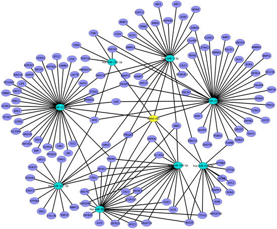 Interaction networks of VWA8-AS1–miRNA–mRNA (yellow: VWA8-AS1, blue: miRNA, purple: mRNA).
