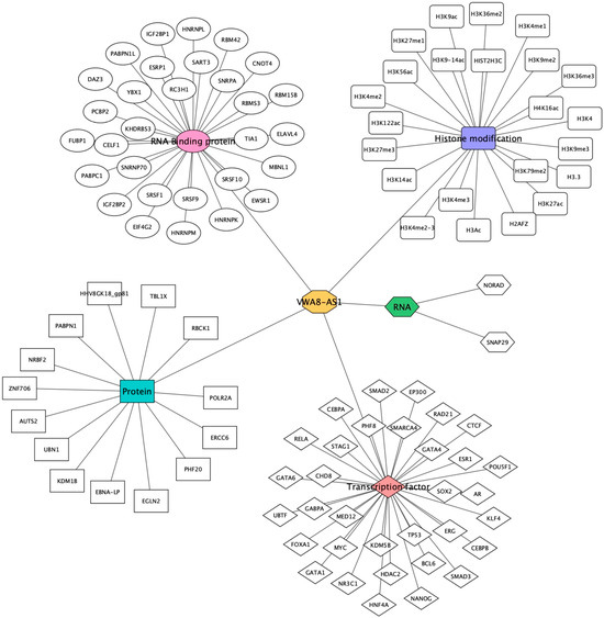 Another possible function of lncRNAs in regulating cellular processes is their capacity to bind with proteins. The interaction between VWA8-AS1 and its targets was identified using RNAINTER and RBPMAP. The findings indicate that VWA8-AS1 contains multiple binding sites for a variety of proteins, including RNA-binding proteins, transcription factors, and histone modification proteins, as well as other RNAs (Figure 6).