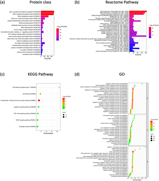 GO enrichment and KEGG pathway analysis of mRNA targets associated with VWA8-AS1. (a) Protein class. (b) Reactome pathway. (c) KEGG pathway. (d) GO.