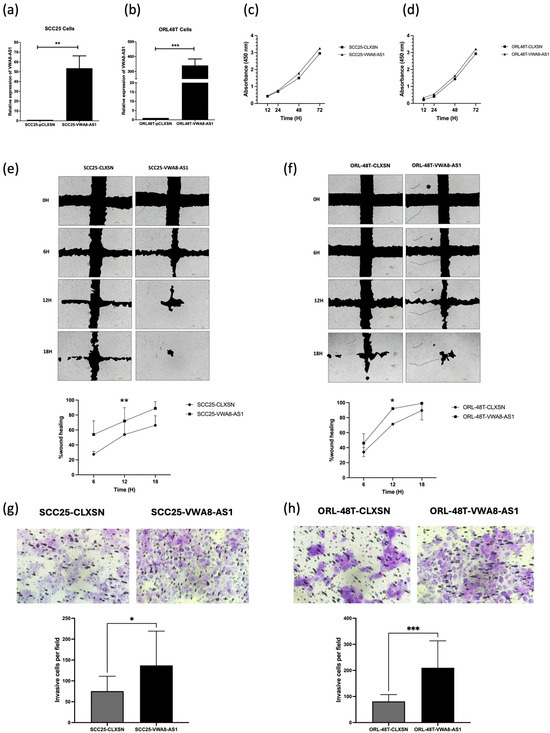 Cell migration was evaluated in SCC25-VWA8-AS1 cells compared to SCC25-CLXSN cells, and in ORL-48T-VWA8-AS1 cells compared to ORL-48T-CLXSN cells, using a wound healing assay. The results revealed that VWA8-AS1 overexpression significantly increased the migration of both SCC25-VWA8-AS1 and ORL-48T-VWA8-AS1 cells 12 h after incubation, in comparison to their respective control counterparts (p = 0.0094 and p = 0.0133, respectively) (Figure 9e,f). Moreover, a study of cell invasion was undertaken via a Transwell assay in SCC25-VWA8-AS1 cells compared to SCC25-CLXSN cells, and in ORL-48T-VWA8-AS1 cells compared to ORL-48T-CLXSN cells. The results showed that the overexpression of VWA8-AS1 in oral cancer cells induced cell invasion in both SCC25-VWA8-AS1 and ORL-48T-VWA8-AS1 compared to their respective control counterparts (p = 0.0403 and p = 0.0006, respectively) (Figure 9g,h). These findings suggest that the overexpression of VWA8-AS1 enhances the migration and invasion of oral cancer cells, thereby promoting tumor progression.