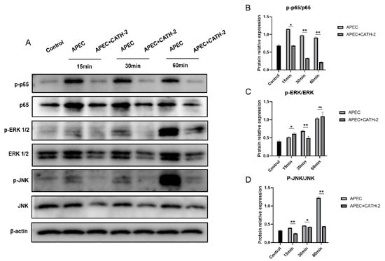 2.3. CATH-2 Inhibits APEC-Induced NF-κB and MAPK Signaling Pathway Activation in Macrophages