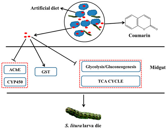 A hypothesized schematic diagram of coumarin effect on enzymes and glycometabolism in S. litura.