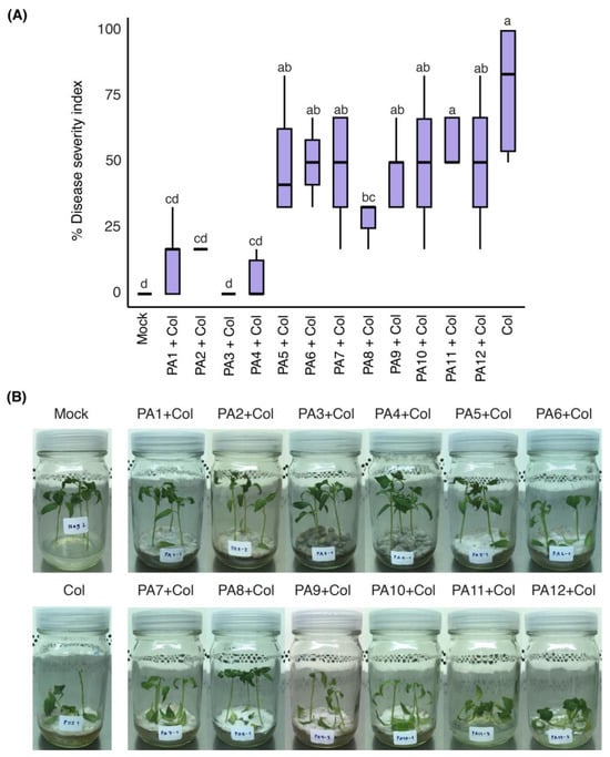 Induced systemic resistance assay of the fractions (PA1 to PA12) isolated from the ethyl acetate extract of CF-SWUC02 in yellow chili seedlings. (A) % DSI represented as box plots (n ≥ 6). Different letters (a, b, c, d) indicate significant differences (p < 0.05). (B) Disease symptoms observed on seedlings at seven dpi. Col = C. truncatum CFPL01.