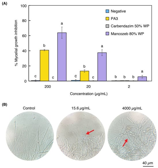 Percentage of mycelial growth inhibition (% MGI) and abnormalities in Col germination under PA3 treatment. (A) % MGI by PA3, carbendazim 50% WP, and mancozeb 80% WP at 200, 20, and 2 µg/mL. The negative control was potato dextrose agar without any supplements. Bars represent mean ± SD. Difference letters (a, b, c) indicate significant differences (p < 0.05) between treatments within each concentration. (B) Microscopic observations (1000×) of germinated hyphae from conidia treated with PA3 at 0 (control), 15.6, and 4000 µg/mL. Red arrows highlight abnormalities.