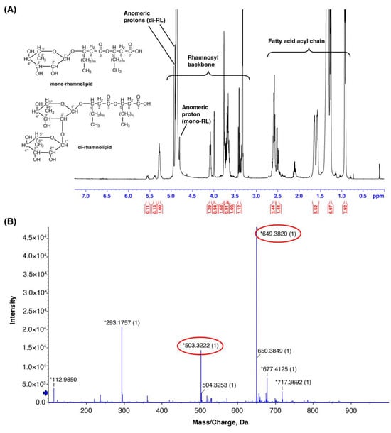 PA3 characteristic by 1H NMR and ES-MS spectroscopic data. (A) 1H NMR spectrum of PA3 in CD3OD, showing characteristic proton signals with the chemical structure of mono- and di-RLs displayed. (B) Negative-ion electrospray mass spectrum of PA3, with red circles highlighting the main detected peaks corresponding to molecular ions of mono- and di-RLs. The blue arrow indicates the detection limit, while the asterisks indicate the calculated monoisotopic masses of the detected ions.