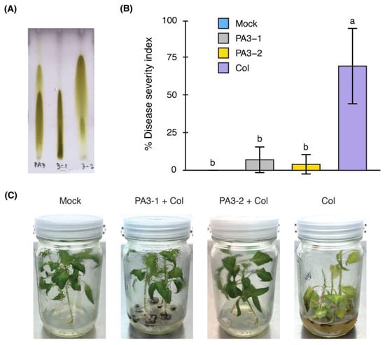 Characterization of PA3 subfractions (PA3-1 and PA3-2) and their effects on disease symptoms in yellow chili seedlings. (A) Thin-layer chromatography (TLC) plate analysis of PA3 (left), PA3-1 (middle), and PA3-2 (right), visualized with p-anisaldehyde staining. (B) Percentage disease severity index (% DSI) of seedlings in mock, PA3-1, PA3-2, and Col treatments. Bars represent mean ± SD. Different letters (a, b) indicate significant differences (p < 0.05). (C) Disease severity symptoms observed on seedlings across different treatments.