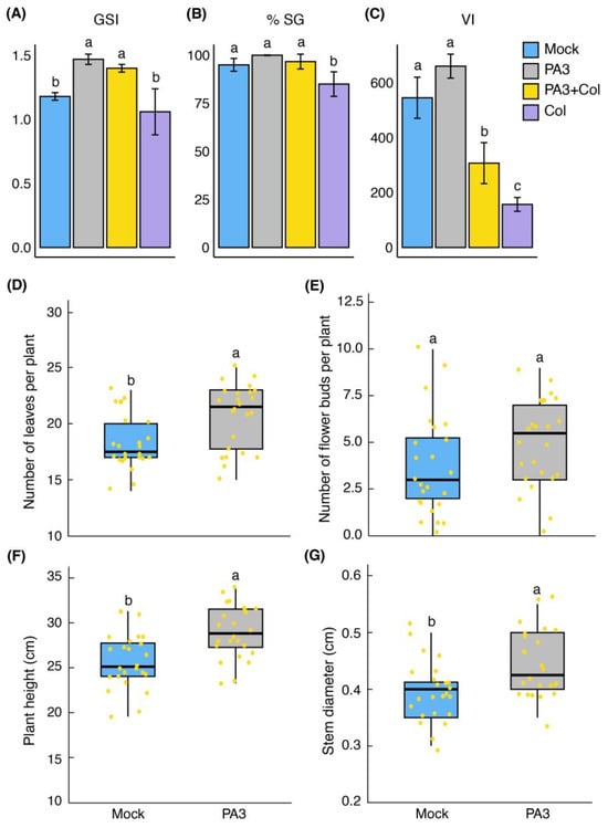 Effects of PA3 application on seed germination and plant growth of yellow chili. (A) Germination speed index (GSI). (B) Percentage of seed germination (% SG). (C) Vigor index (VI). (D) Number of leaves per plant. (E) Number of flower buds per plant. (F) Plant height (cm). (G) Stem diameter (cm). Each dot represents an individual sample. Different letters (a, b, c) indicate statistically significant differences between treatments (p < 0.05).