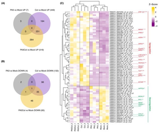 Venn diagrams and heatmap of DEGs related to defense response. (A) Venn diagram showing the number of upregulated DEGs. (B) Venn diagram showing the number of downregulated DEGs. (C) Heatmap of 70 defense-related DEGs identified by GO terms, displaying Z-scores of gene expression levels. Genes highlighted in red indicate upregulated genes, while those in green indicate downregulated genes. Superscripts indicate the following: C = significant DEGs in Col treatment alone, PC = significant DEGs in PA3+Col treatment, and C + PC = significant DEGs in both treatments.