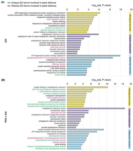 Top 10 enriched GO terms across three categories—biological process (yellow), cellular component (purple), and molecular function (blue)—related to DEGs. (A) Enriched GO terms in the Col treatment alone. (B) Enriched GO terms in the PA3+Col treatment. Unique defense-related GO terms are indicated in green, while shared defense-related GO terms between treatments are highlighted in pink.