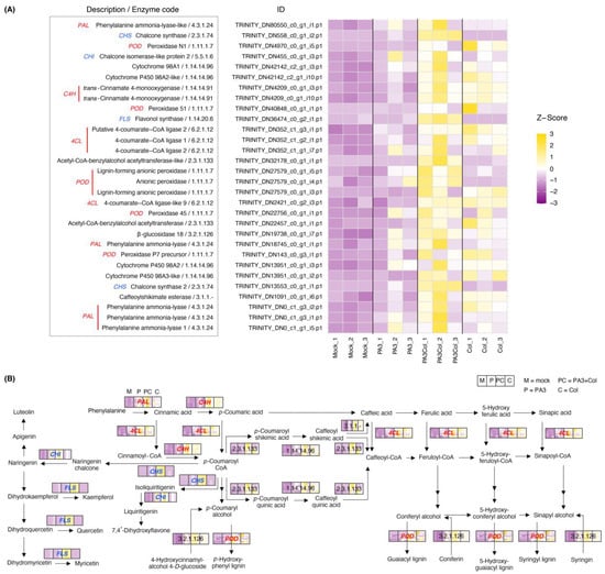 Differential expression of DEGs involved in the phenylpropanoid and flavonoid biosynthesis pathways across different treatments. (A) The heatmap shows DEGs with their respective enzyme codes and gene IDs, with gene expression levels represented as Z-scores, indicating relative expression changes compared to the mean expression across treatments. (B) The schematic diagram illustrates the phenylpropanoid and flavonoid biosynthesis pathways. The colors within the boxes correspond to the Z-scores in the heatmap. Treatments are abbreviated as M = mock, P = PA3, PC = PA3+Col, and C = Col. DEGs encoding enzymes involved in the phenylpropanoid pathway are shown in red text, while those involved in the flavonoid pathway are shown in blue text.