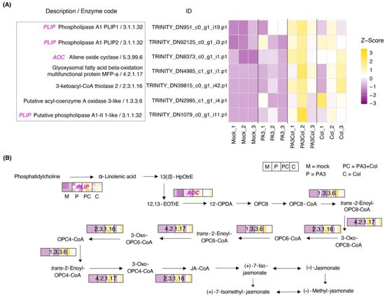 Furthermore, we observed upregulation of genes involved in JA biosynthesis within the α-linolenic acid metabolism pathway, particularly with the PA3+Col and Col treatments (Figure 9 and Table S8). Plastid lipases (PLIP; 3.1.1.32), which release α-linolenic acid from galactolipids and phospholipids, and allene oxide cyclase (AOC; 5.3.99.6), which converts 12,13-epoxy-9(Z),15(Z)-octadecatrienoic acid (12,13-EOTrE) to cis-(+)-12-oxo-phytodienoic acid (12-OPDA), were upregulated. Subsequent transformations of 12-OPDA to JA involved acyl-coenzyme A oxidase 3-like (1.3.3.6), glyoxysomal fatty acid β-oxidation multifunctional protein MFP-a (4.2.1.17), and 3-ketoacyl-CoA thiolase (2.3.1.16).