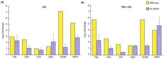 Validation of gene expression levels by RNA-seq and RT-qPCR for six DEGs: PAL, C4H, CHI, AOC, ECHB, and BPR1. (A) Fold change comparison in the Col treatment alone relative to the mock treatment; and (B) fold change comparison in the PA3+Col treatment relative to the mock treatment. Yellow bars represent RNA-seq results, while purple bars represent RT-qPCR results, shown as log2 fold change.