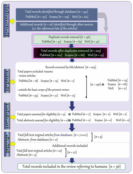 A total of 341 records published in English were identified through the databases listed above, i.e., 152 through PubMed, 129 through Scopus, and 60 through WoS. After removal of 136 duplicate items (PubMed: 32, Scopus: 63, and WoS: 41), the remaining records (n = 205; PubMed: 120, Scopus: 66, and WoS: 19) were initially screened by title and abstract. Afterwards, review articles and those that did not address the topic were excluded (PubMed: 113, Scopus: 66, and WoS: 17). Next, a total of 9 potentially relevant full-text articles (PubMed: 7 and WoS: 2) were further examined. Moreover, 27 additional records (i.e., 22 full-text original articles and 5 abstracts) relevant to the topic were included by manual review of bibliographies. Finally, a total of 36 records (i.e., 31 full-text original papers and 5 abstracts) were included in the current review.
