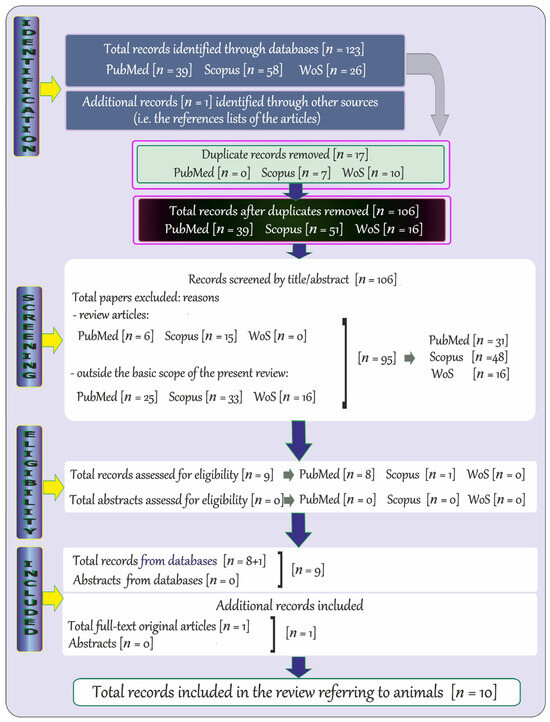 At the beginning, a total of 123 records published in English were revealed through the databases, i.e., 39 through PubMed, 58 through Scopus, and 26 through WoS. Next, a total of 17 duplicate records (PubMed: 0, Scopus: 7, and WoS: 10) were removed, and the remaining items (n = 106; PubMed: 39, Scopus: 51, and WoS: 16) were initially screened by the titles and abstracts. Afterwards, review articles (n = 21; PubMed: 6, Scopus: 15, and WoS: 0) and records that were far beyond the topic addressed in the present review were excluded (n = 74; PubMed: 25, Scopus: 33, and WoS: 16), and 9 potentially relevant items were further examined (PubMed: 8, Scopus: 1, and WoS: 0). Finally, a total of 9 records from databases and 1 additional record relevant to the topic (included by manual review of bibliographies) were included (10 in total).