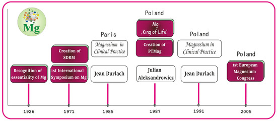 A brief historical view of Mg is summarized in the timeline in Figure 3 to draw attention to some important events associated with this essential nutrient. As illustrated, in 1926, the essential character of Mg was acknowledged [6]. Forty-five years later, in 1971, the First International Symposium on Magnesium was organized and the international Society for the Development of Research on Magnesium (SDRM), which promotes the publication of Mg books and Mg journals, was created [7,8]. Fourteen years after this event, i.e., 1985, Professor Jean Durlach (a French scholar) summarized the state of knowledge about Mg at that time in an extensive monograph entitled Le Magnésium en Pratique Clinique, which was published in many countries, including in Poland in 1991. In Poland, the initiator of the studies on Mg was Professor Julian Aleksandrowicz, who emphasized the unique role of this bioelement in the human body, calling it the ‘King of life’. In 1987, Professor Julian Aleksandrowicz led to the establishment of the Polish Society for Magnesium Research (PTMag in Polish) and became its first chairman [9]. The cooperation between Professor Julian Aleksandrowicz and Professor Jean Durlach resulted in the organization of the first European Magnesium Congress in Cracow (Poland) in 2005.