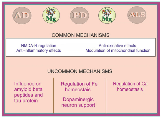 Further, some studies summarized in this section demonstrated that the concentration of Mg in the blood of AD individuals significantly decreased, whereas the concentration of this mineral significantly increased in PD patients. Moreover, the decrease in the concentration of Mg in the blood of AD patients intensified with the severity of the disease. These data may suggest a potential role of Mg in the etiopathogenesis of AD and PD and point to a specific Mg pattern which can characterize AD and Parkinsonism. It was also found, in a systematic review and meta-analysis, that serum and plasma levels of Mg were significantly reduced in AD patients compared with healthy controls, which could indicate that Mg deficiency may be a risk factor of AD and Mg supplementation may be a potentially valuable adjunctive treatment for AD [77]. However, other studies did not indicate any significant alterations in the level of Mg in the blood of both AD and PD subjects. Therefore, further investigations with a larger number of participants and standardized ways to measure Mg levels with an assessment of intracellular free Mg should established to improve our understanding of the findings. It also cannot be excluded that such research may help with the use of Mg in the serum/plasma as a potential biomarker of progression/severity of AD/PD. Moreover, taking into account the results of a study conducted by Miyake et al. [78], who examined the relationship between Mg consumption and the risk of PD in non-Western populations and demonstrated that a higher intake of this bioelement was independently associated with a reduced risk of PD, as well as the study of Powers et al. [79], who examined the associations of PD with dietary nutrients, including minerals, vitamins, and fats (a case–control study in the Seattle area) and found no relationship between intake of Mg and PD, further epidemiological studies with standardized methods of dietary assessment are also required to better recognize the exact role of Mg in neurodegenerative disorders. Additionally, there is a need for well-designed and carefully controlled clinical trials involving Mg in AD, PD, and ALS patients; such trials could provide more valuable information and clarify whether supplementation with Mg could be an adjunctive treatment in these neurodegenerative diseases. Details on this issue are provided in the further part of this review.