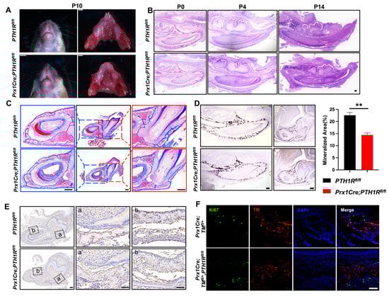 - Cui, C.; Bi, R.; Liu, W.; Guan, S.; Li, P.; Song, D.; Xu, R.; Zheng, L.; Yuan, Q.; Zhou, X.; et al. Role of PTH1R Signaling in Prx1+ Mesenchymal Progenitors during Eruption. J. Dent. Res. 2020, 99, 1296–1305. [Google Scholar] [CrossRef] [PubMed]