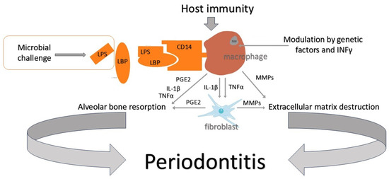 Schematic illustration of the destruction of the alveolar bone and connective tissue in the course of periodontitis. Lipopolysaccharide (LPS), a major virulence factor for Gram-negative bacteria, binds to the lipid-binding protein (LBP). This complex is recognized by the CD14 receptor on monocytes/macrophages. Association of the LPS–LBP complex with the CD14 receptor initiates trans-membrane signaling that activates the cell to synthesize and secrete prostaglandin 2 (PGE2), the cytokines TNFα and IL-1β, and extracellular matrix metalloproteinases (MMPs). TNFα and IL-1β bind to receptors on fibroblasts and initiate signaling for the synthesis and secretion of MMPs and PGE2. MMPs mediate the loss of gingival extracellular matrix and periodontal ligament, while PGE2 leads to bone destruction. TNFα and IL-1β can also directly influence minor bone loss.