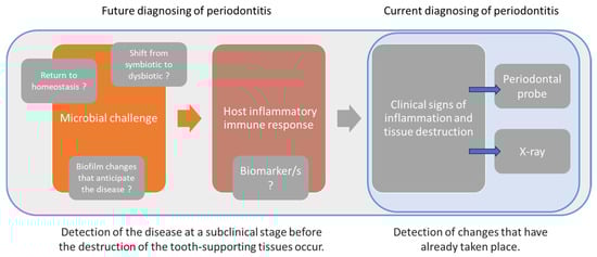Therefore, there is a great need among clinicians to have diagnostic tests that not only describe the periodontal changes that have occurred in the tissues but also allow them to detect disease at a subclinical stage before destruction of the tooth-supporting tissues occurs. This test would enable clinicians to follow the course of the disease and detect areas prone to exacerbation, with the possibility of being used to evaluate the effectiveness of ongoing periodontal therapies (Figure 2). Unfortunately, we do not have such a diagnostic method yet. The hope is molecular diagnostics, which is constantly being developed but not widely used in the clinic. There are numerous studies on biomarkers of periodontal disease. Point-of-care tests are also emerging. However, they have a minor role in the overall diagnostic process.