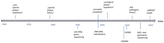 Hypotheses on the role of bacteria in the etiopathogenesis of periodontal disease and milestones in the study of the oral microbiome on a timeline. (HOMIM—Human Oral Microbe Identification Microarray, HOMD—the Human Oral Microbiome Database, IMPEDE—Inflammation-Mediated Polymicrobial Emergence and Dysbiotic Exacerbation).