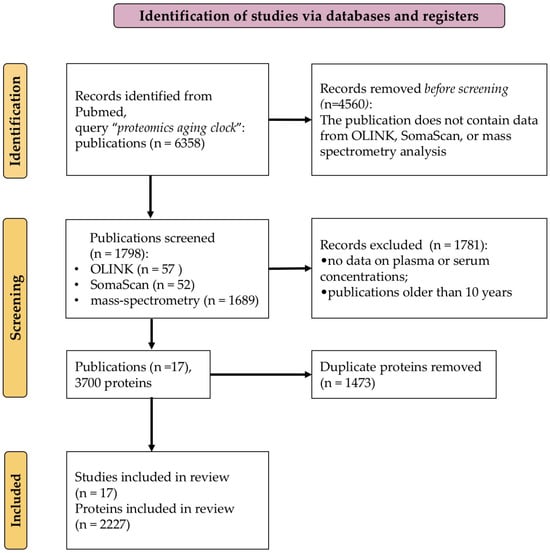 Kliuchnikova, A.A.; Ilgisonis, E.V.; Archakov, A.I.; Ponomarenko, E.A.; Moskalev, A.A. Proteomic Markers of Aging and Longevity: A Systematic Review. Int. J. Mol. Sci. 2024, 25, 12634. https://doi.org/10.3390/ijms252312634