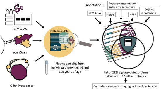 - Moaddel, R.; Ubaida-Mohien, C.; Tanaka, T.; Lyashkov, A.; Basisty, N.; Schilling, B.; Semba, R.D.; Franceschi, C.; Gorospe, M.; Ferrucci, L. Proteomics in aging research: A roadmap to clinical, translational research. Aging Cell 2021, 20, e13325. [Google Scholar] [CrossRef]