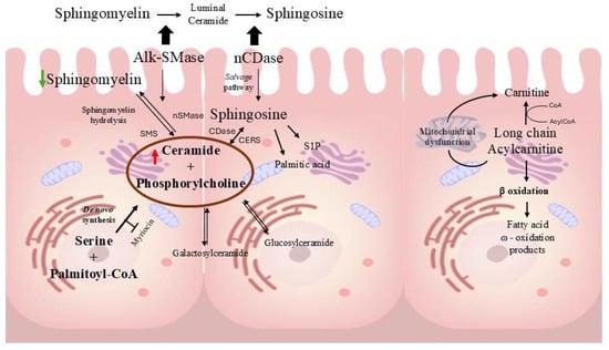 Ceramide pathway within the intestinal lumen, highlighting the key steps involved in ceramide metabolism and fatty acid oxidation. S1P: sphingosine-1-phosphate, SMS: sphingomyelinsynthases, AlkSMase: alkaline sphingomyelinase, nCDase: neutral ceramidase. The red narrow indicates an increase in ceramides, while the green narrow shows a decrease in sphingomyelins.