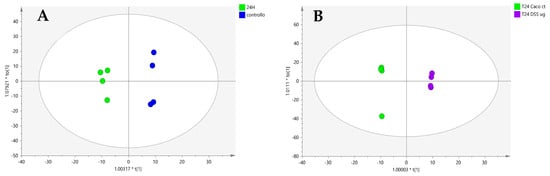 Data were pre-processed using the Mass Profinder 10.0 software (Agilent Technologies, Santa Clara, CA, USA), which enables mass recalibration and deconvolution, providing a data matrix that includes all features present across all samples. Mass spectrometry features were filtered according to their presence in QC samples, with a threshold set at 20%. The resulting data matrix was processed using SIMCA 15.0 software (Sartorius, Umeå, Sweden). Initially, data were autoscaled by UV scaling, and then a Principal Component Analysis (PCA) was performed (Figure S1). This unsupervised method aids in visualizing the distribution of samples and variables in a multivariate space, as well as in highlighting deviating features and the presence of outliers. Subsequently, a partial Least Squares Discriminant Analysis (PLS-DA) and its orthogonal extension (OPLS-DA) were employed. These supervised classification models were used to visualize and evaluate the discriminative variables between samples assigned to different classes. The variable importance in the models is reported as VIP score, and values > 1.0 were deemed as discriminant. The outcomes of the OPLS-DA analyses were validated by testing 400 permutations (Figure S2) []. The statistical significance of the mean difference was also assessed using Student’s t-test.