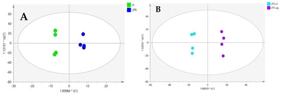 OPLS-DA score plots of Caco-2 cells treated with LPS under terrestrial gravity (A) and Caco-2 cells treated with LPS under simulated microgravity (B). In plot A, control samples are represented by green circles, while blue circles represent samples treated with LPS. In plot B, control samples are represented with light blue circles, while violet circles represent samples treated with LPS under simulated microgravity. Validation parameters for the statistical model are indicated with R2Y and Q2 values.