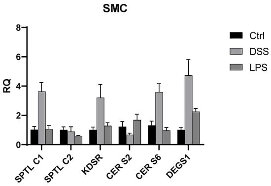 The bar graph compares the relative quantification (RQ) of various gene expressions (SPTLC1, SPTLC2, KDSR, CERS2, CERS6, and DEGS1) in SMC (0 g) under three conditions: Ctrl g0 (black), DSS g0 (light gray), and LPS g0 (dark gray). The results suggest an increased gene expression in the DSS g0 and LPS g0 conditions compared to the control, with DEGS1 showing the higher expression level, especially under the DSS g0 condition. Error bars indicate the standard deviation of gene expression levels across the samples.