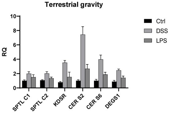 The bar graph of the relative quantification (RQ) of various gene expressions (SPTLC1, SPTLC2, KDSR, CERS2, CERS6, and DEGS1) in terrestrial gravity conditions (1 g) for three groups: Ctrl g1 (black), DSS g1 (light gray), and LPS g1 (dark gray). Gene expression is generally higher in the DSS g1 and LPS g1 conditions compared to the control. Notably, CER S2 showed the highest increase in expression, particularly in the LPS g1 and DSS g1 groups. Error bars indicate the standard deviation of gene expression levels across the samples.