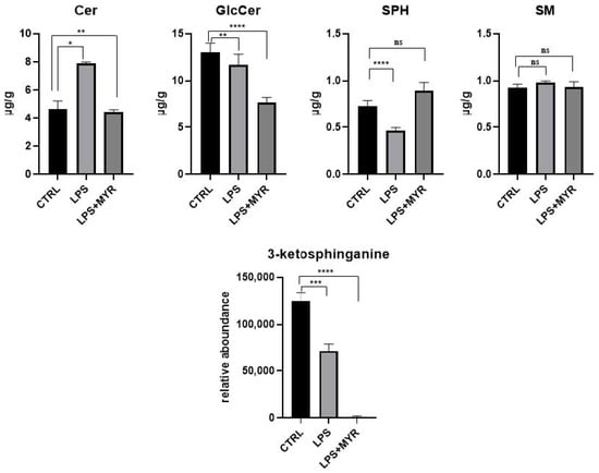 Levels of ceramides, glucosylceramides, and sphingosines in Caco-2 cells expressed in µmol/g: comparison among control samples, LPS, and LPS with myriocin treatment. **** p < 0.00001, *** p < 0.0001, ** p < 0.001, * p < 0.01, ns p > 0.05. Relative abundance of the lipid 3-ketosphinganine in LPS and LPS + myriocin (MYR).