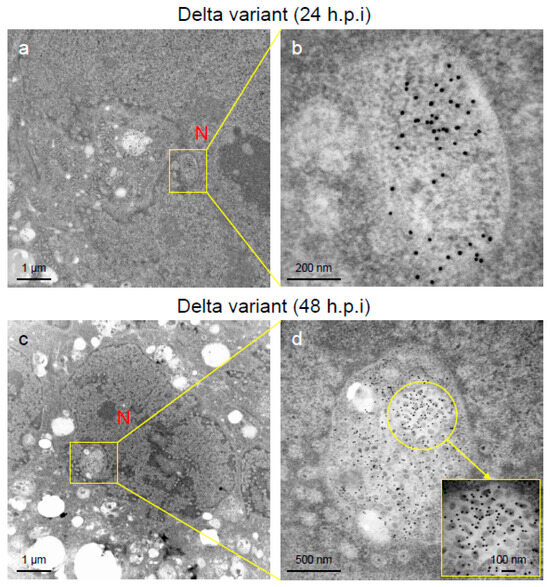 Nucleocapsid (N-protein) and virions of severe acute respiratory syndrome virus 2 (SARS-CoV-2) were detected in the nucleus of the Delta-infected VeroE6/TMPRSS2 cells. (a–d) The ultrathin sections of the infected cells at 24 h post-inoculation (h.p.i.) or 48 h.p.i were stained with anti-SARS-CoV-2 N-protein antibody. The representative immunoelectron microscopic images indicate the replication and accumulation patterns of SARS-CoV-2 N-protein (gold labeling) and virions of various sizes and multiform morphology in the nucleus of the Delta-infected cells. N: nucleus.