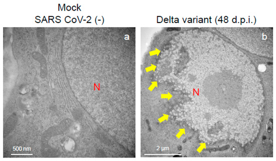 The Delta variant of severe acute respiratory syndrome coronavirus 2 (SARS-CoV-2) showed greater nuclear membrane damage potential in the VeroE6/TMPRSS2 cells. The representative transmission electron microscopy images indicate the intact nuclear membrane of mock-infected cells (a) and damaged nuclear membrane of Delta-infected cell (b). Arrows indicate the nuclear membrane damage at 48 h post-inoculation. N: nucleus.
