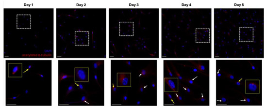 To visualize the presence of primary cilia, primary human PDL cells were seeded at a density of 10,000 cells per coverslip in 1 mL of culture medium and maintained on glass-bottom dishes (Marienfeld Laboratory Glassware, Lauda-Königshofen, Germany) for a period of five consecutive days. On each day, cells were fixed with paraformaldehyde (PFA, Sigma-Aldrich, St. Louis, MO, USA) prior to incubation with the primary antibody against acetylated α-tubulin at 4 °C overnight. Bound antibodies were detected using fluorescent secondary antibody Alexa Fluor 568, applied at room temperature for 1 h. Nuclei were counterstained with DAPI for 10 min.
